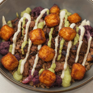 Indulge in our Fritanga Churrasco Bowl, featuring your choice of white rice or Gallo Pinto (a traditional blend of rice and beans) piled high with juicy grilled skirt steak, crispy fried cheese cubes, and sweet fried plantains. Topped with our signature homemade cilantro sauce and creamy crema
