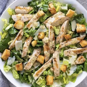 Grilled chicken breast, Romaine lettuce, croutons, parmesan cheese, and caesar dressing