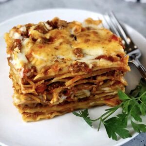 Classic Italian-style lasagna with ground beef, creamy cheeses, and house-made marinara with mozzarella cheese