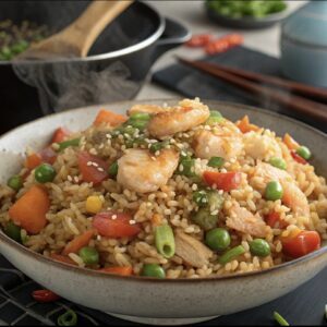 Savory fried rice loaded with shrimp, pork, and ham, all tossed in garlic butter and paired with sweet plantains.